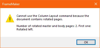 So this is a stand-alone TOC, generated from a single FrameMaker file (and not a book TOC)? In that scenario, FrameMaker will use a copy of that FrameMaker file for the TOC. If the file has two columns, than the TOC will have two columns until you change them. Rotated pages in FrameMaker documents are fairly rare and probably not necessary for the TOC. Can you just remove the two rotated master pages and then see if you change the columns using Format > Page Layout > Column Layout? Alternatively, navigate to the Right Master, control-click to select the template frame and use Format > Customize Layout > Customize Text Frame > Text Frame > Columns Number: 1. Repeat for the Left Master. When you return to the body pages, they should be 1 column.