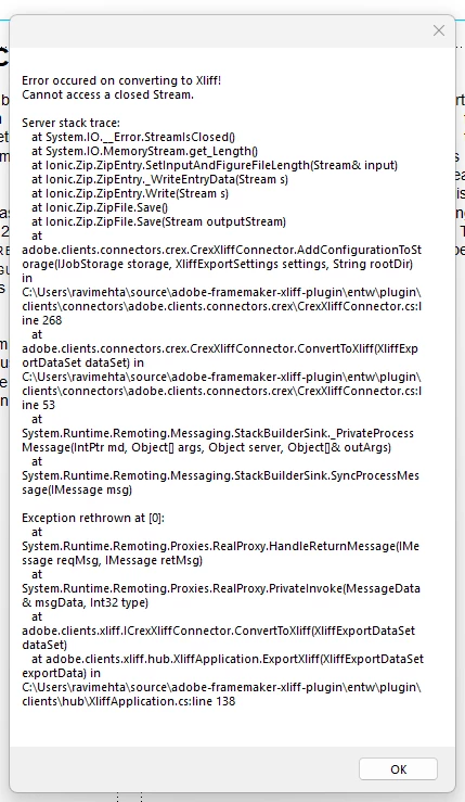 Like many others I'm having issues using the native export to XLIFF 1.2. I followed the advice here: https://community.adobe.com/t5/framemaker-discussions/xliff-export-is-crashing-fm-17-0-5/m-p/14987109#M85850 but the suggested solution did not work for me. If I try and save an entire book it temporarily creates the .mif files but once it gets to the end it stops responding then crashes. If I export a single page it gives this error: