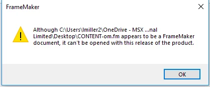 Can anyone give me some advice on how to open a Framemaker 2017 document with the following release error.