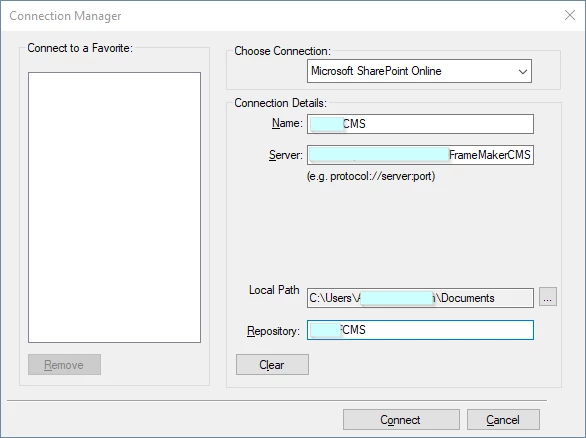 - In the Connection Manager window, select Microsoft Sharepoint Online, enter the server name, create a name, and enter the Repository (In the Repository field, I've tried entering "Documents" or a custom documents folder named "fmtest" (as shown in the following image)).