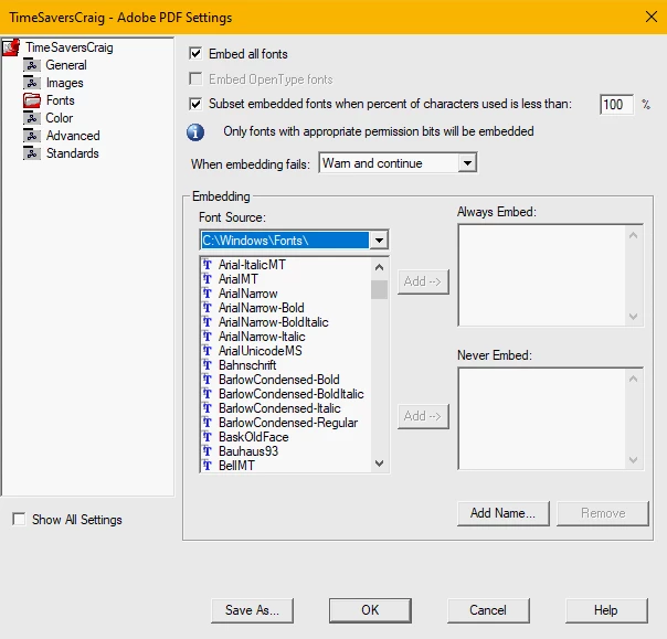 - I tried using the fonts in other programs (Word) and printing to PDF, which worked just fine and embedded the fonts.