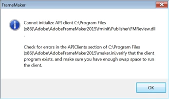 Cannot initialize API client C:\Program Files (x86)\Adobe\AdobeFrameMaker2015\fminit\Publisher\FMReview.dll