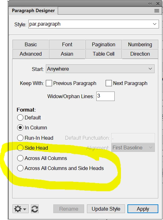 Can you give me an idea how to make the Heading1First span both columns for the Index title?