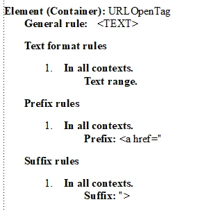 I'm creating an element in my EDD to add custom HTML/CSS tags using Prefix rules. However, I found that FrameMaker automatically adds the ">" character to the end of the Prefix rules, e.g. the Prefix Rule: <a href= shows as <a href=> in the document. Using Autonumbering can't be used because the autonumbering isn't copied when we copy the text from the document into another application.