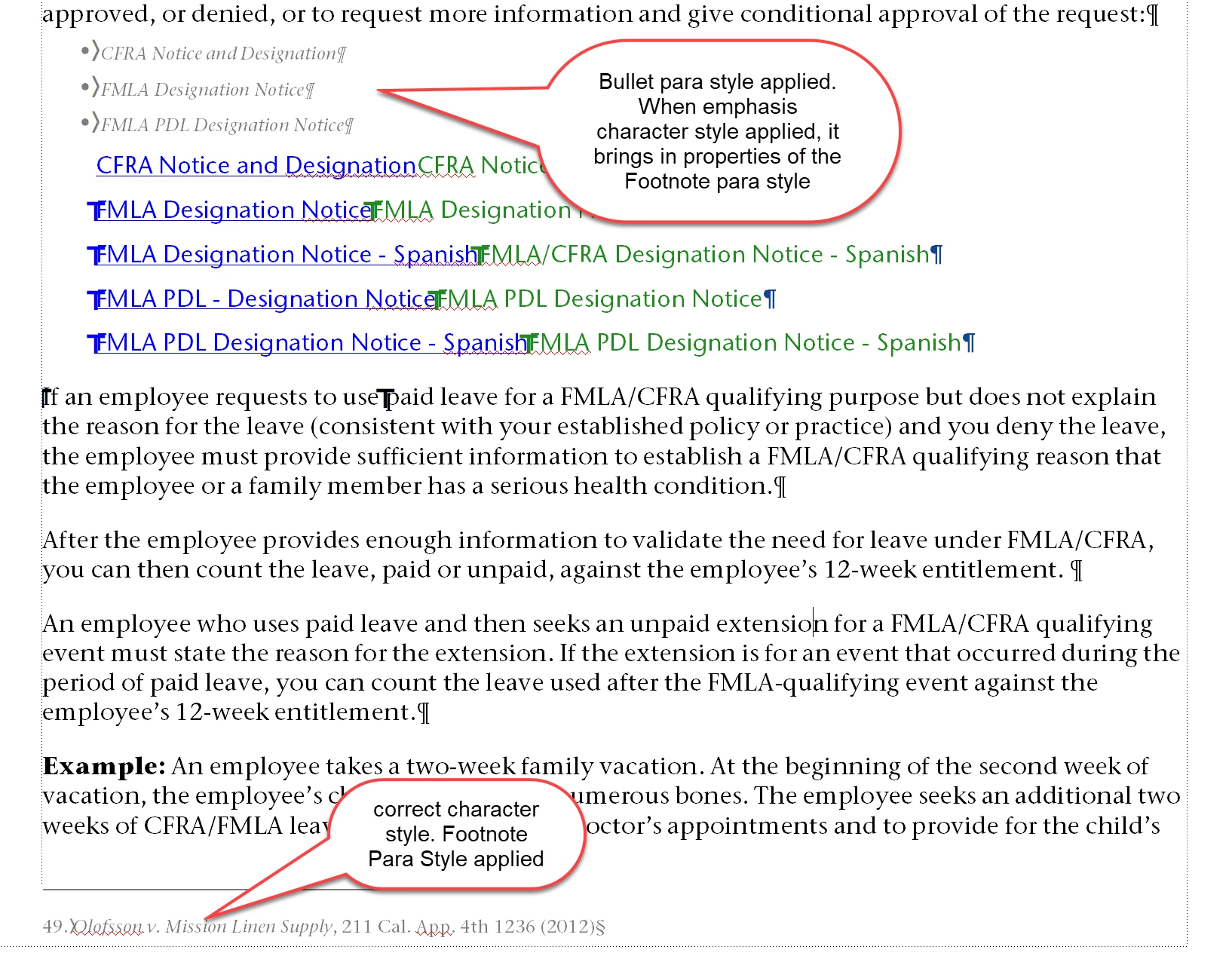 There is a footnote paragraph style that uses 7.5 pt, 51% process grey font. When we are reference a legal case name, we italicize it using a character style called emphasis (see attached images).