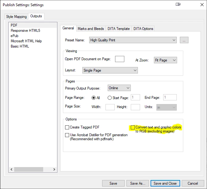 Choose File > Publish, click the PDF icon, and click the icon in the lower right to edit the STS file. Uncheck the Convert text and graphic colors to RGB checkbox and save the STS file.