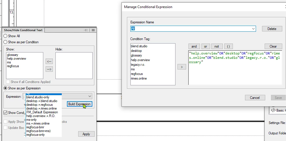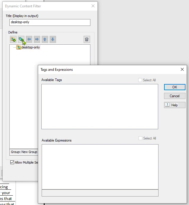 I am using FM2019. When I go to Publish-Dynamic Content Filter, I have nothing in the Tags and Expressions pane, despite having created tags and expressions. Here were my steps: