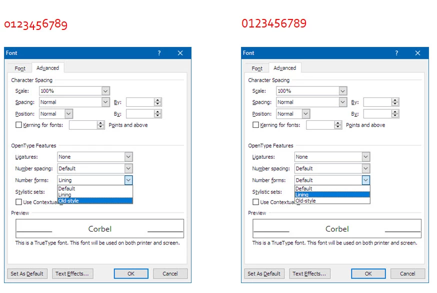 We are changing the corporate font to Corbel. The default Corbel number style is awkward and would like to change it from 'old style' to 'lining'. It is possible in Microsoft apps, in FM, cannot find any options for defining the number stylistic set. Woul appreciate any hints.
