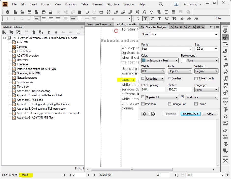 A few weeks of checking documents ahead, after corporate decisions to change fonts and colours … actually going pretty smoothly, now I've created a single stylesheet file, but every now and then I find unexpected special cases. Creating or updating a paragraph style is easy, with the Esc opn and Esc opu shortcuts: but where are the equivalents for character styles?