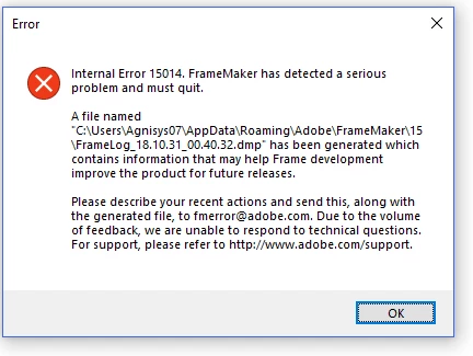I have installed FDK2019(32-bit) and Framemaker2019(32-bit) and created a new DRE file from the existing DRE files in FDK Directory. When i am going to save it as abc.dre the framemaker gives below mentioned error.