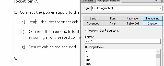 I am a new user. When I create a numbered list and one of the items has a lettered sub list, the continuing numbered list takes account of the lettered items and starts numbering from there, not from the previous number. How do I get around this? Also, I want the lettered list to start at a), the pic shows how I have the style set up for this. I am having trouble forcing it to do this unless I use a=1 which is what I suspect is the part of the problem in the first part of my question. Thanks.