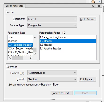2. In the cross reference pod, I click on the building block labled 'hyperlink_blue' and add it to the cross reference I'm trying to create