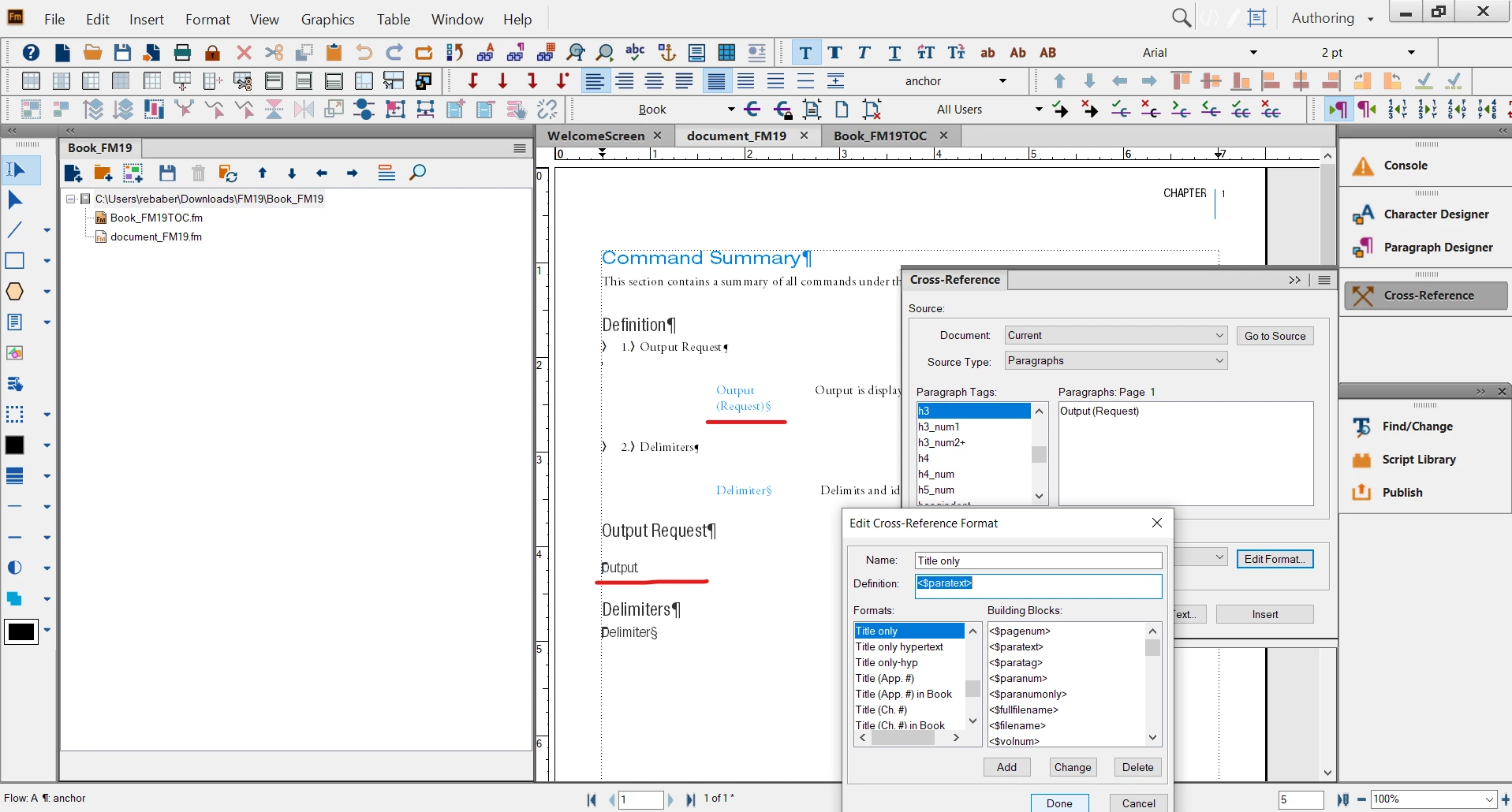 For example, a text with Paragraph format ‘h3’ and Character format ‘white’ applied to part of it, is cross-referenced. Initially, the cross-reference appears fine but as soon as the book is updated, it reverts to the source format (part white) irrespective of the attributes (<Default Font> , <hypertext>, or <newblue>) assigned to it. The results are the same even with other templates, cross-references, and character formats. This issue was not there in FM 10.