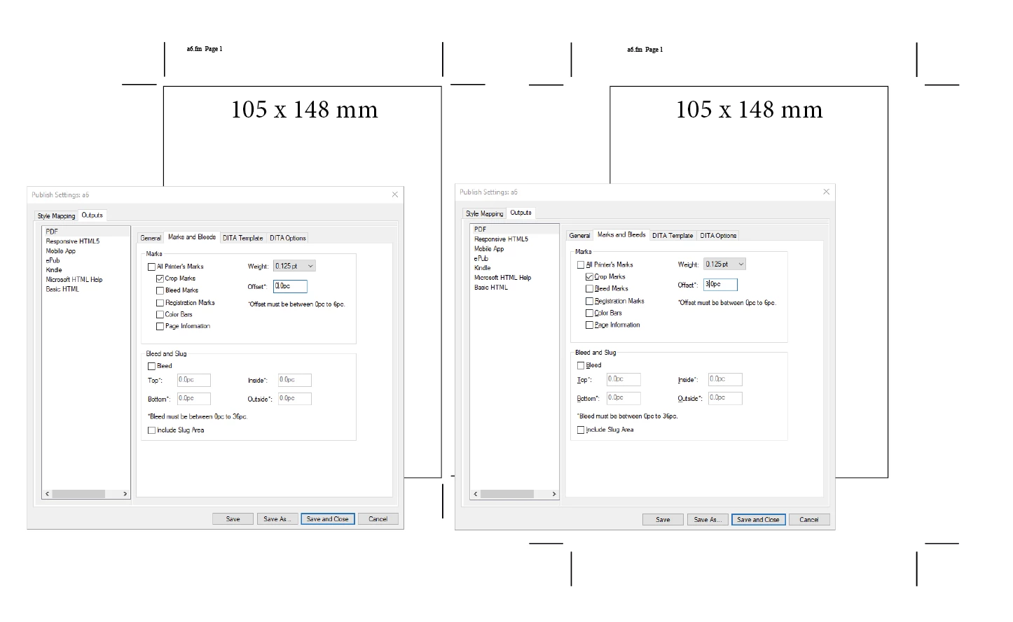 This is an A6 page published to pdf with cropmarks. As can be seen the A6 page apparently changes size when using the offset feature in the Publish Dialogue. Ofsett should merely move the line further out of the bleed area - not change the entire page size. Is this not a bug?