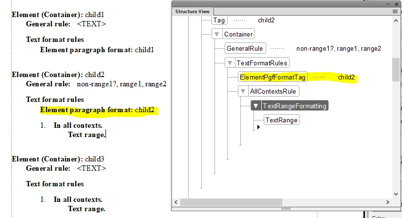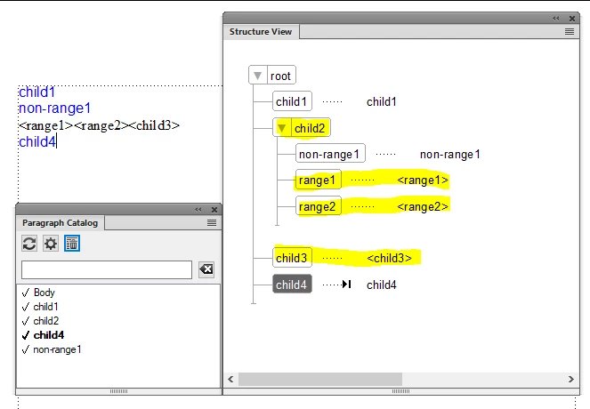 Hi All, I have an interesting EDD issue that I am trying to solve. Here is a screenshot of my document and structure. The requirement is to have the range1, range2, and child3 elements on the same line (in the same paragraph). To achieve that, my EDD has the yellow elements defined as text ranges. And it works.