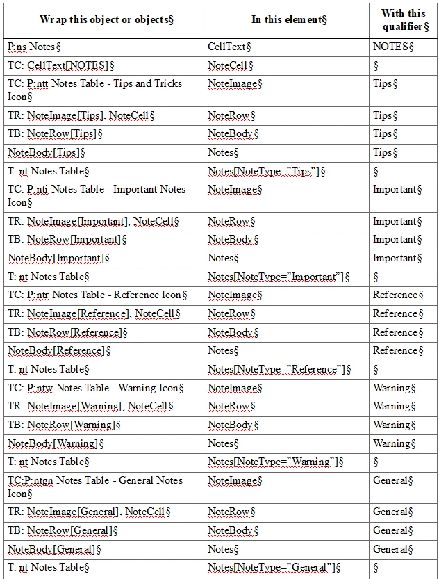 In our unstructured documents, we have a table (nt Notes Table) we use to insert various notes. We use a paragraph style (ns Notes) to format the note text. We also use diffent paragraph styles to insert an appropriate image, depending on the type of note, e.g.: