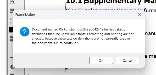 This morning I opened some FrameMaker files that I worked on last week. I didn't add any new fonts or do anything exotic with them, and no one else had access to these files. Only me. Yet, this morning I opened several of these files and got this message: