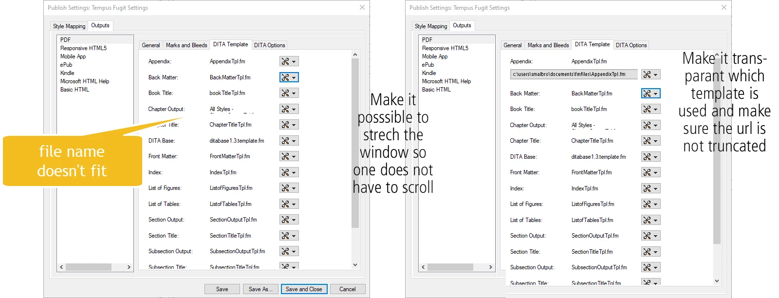 I am working with DITA template design right now and I am constantly annoyed by the design of the PDF Publish dialogue for DITA. So here is my suggestion