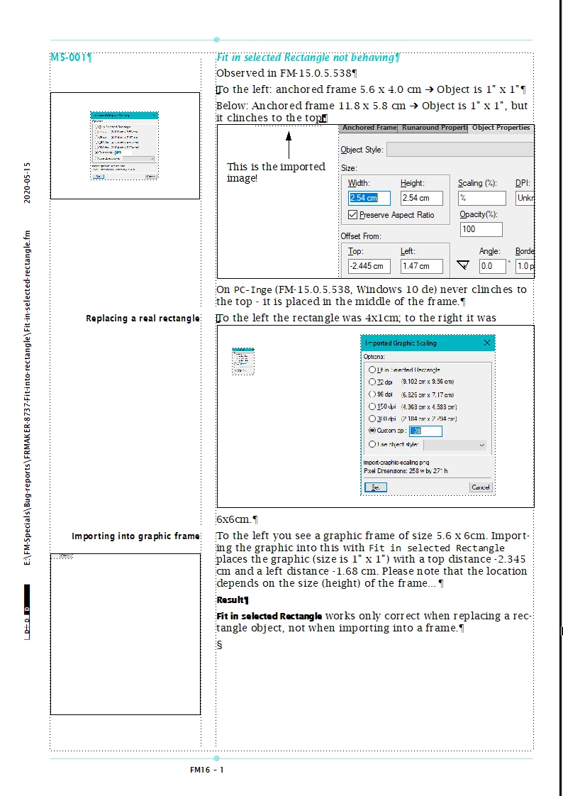 Importing into an anchored frame or a graphic frame scales the image to 1" x 1" independently of frame size. Location within the frame depends on frame size...