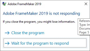 I have received a old reviesion of framemaker files i need to update and FM crash on som of the pages not all, but it is always the same place in the documents. I have located it is every time there is an inset with a |.bmp file (maybe other cases as well). I have reset preference, updated Microsoft.net, have the latest upgrade of FM2019. There is no dumb file created. Frame Make just stop responding when I come to the specific position in the document. I can open all the pictures with no problem from explore.