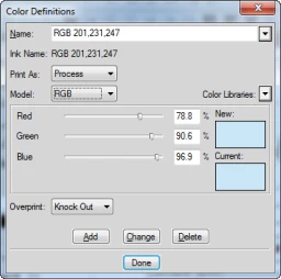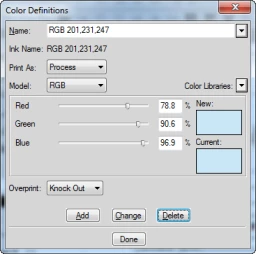 I select a color definition (RGB 201, 231, 247), click Delete,