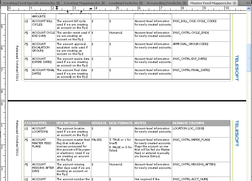 The document open in FM - this shows the Telesoft logo on left and right body pages using the landscape master pages: