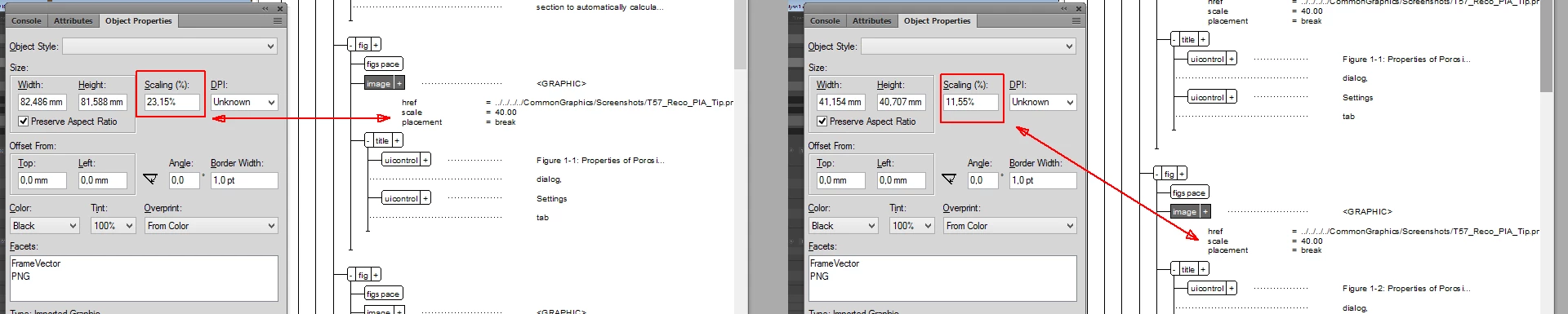 <title>Second Insertion</title></fig> No difference between the two nodes, yet, the value for scale in the object properties dialog in FM are different between the two images. (and the scale value in the dialog ist different from the value the scale attribute)s