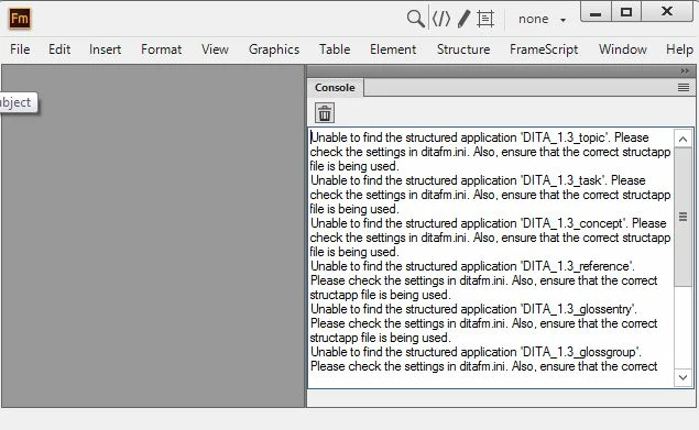 Unable to find the structured application 'DITA_1.3_troubleshooting'. Please check the settings in ditafm.ini. Also, ensure that the correct structapp file is being used.