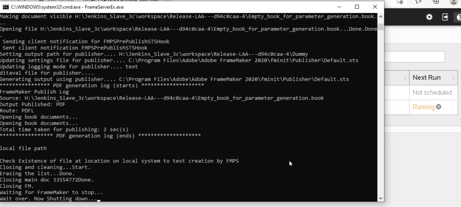 The task ran correctly, Framemaker is closed automatically, however the task status shows RUNNING still and the command window is stuck "waiting for Framemaker to stop".