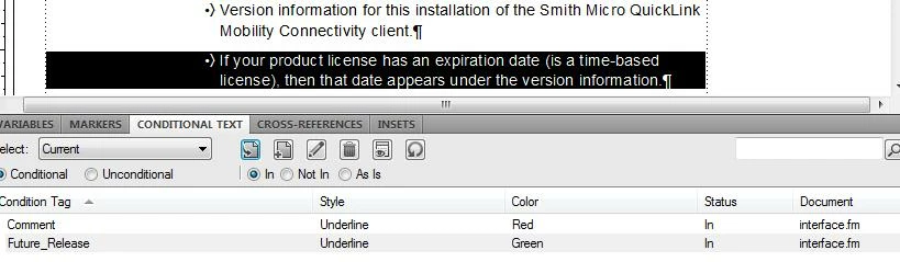 I have FrameMaker 9 on a Dell Latitude 630 laptop running Windows Vista. This is the first time since upgrading (from FM 😎 that I need to use conditionalized text. The Hide/Show options function normally. However, no matter what color or attribute (underline) I set the conditionalized text to, it remains black, non-underlined text. I have tried making the text its own, entire paragraph, but that makes no difference.
