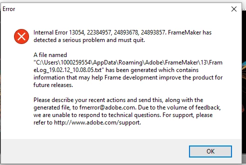 I am running FrameMaker 2015 and cleaning up conditional tags. FrameMaker keeps closing on me when I am doing this. Any thoughts? And do I have to delete each tag individually in the book or can I do it globally in the files in the book? Thank you, This is the message I get when I do get one. Sometimes it just closes