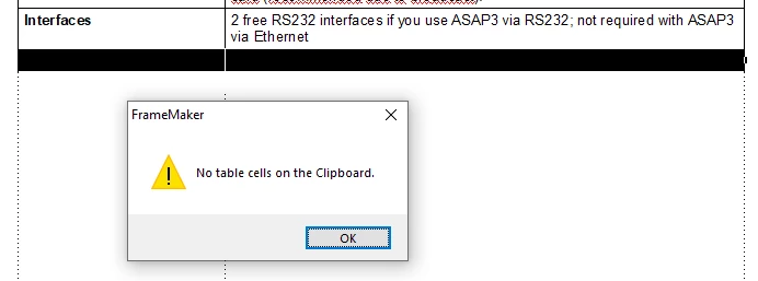 When I copy a table row, then mark another table row and try pasting it there (replacing the selection) and it does not paste correctly, the error message says "No table cells on the clipboard":