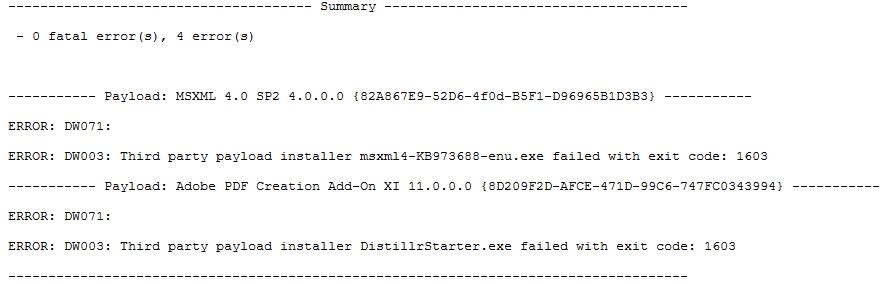 ERROR: DW003: Third party payload installer msxml4-KB973688-enu.exe failed with exit code: 1603