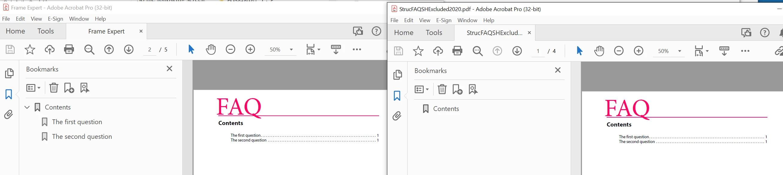 The books typically have a structured first component, which has no content used for bookmark generation, followed by a generated table of contents, followed by one or two structured components, which do have content used for bookmark generation and of course for the toc. The toc provides a single paragraph style 'Content' which becomes the root bookmark, with the selected elements (or context labels) supplying the children and sibling bookmarks. This generates bookmarks exactly as expected. However in 2020, if the first component is excluded (I only just found I could do this, rather than deleting the component, while troubleshooting this bug! 😅), the only bookmark generated is 'Content'. In both 2019 and 2022 the children and sibling bookmarks are generated.