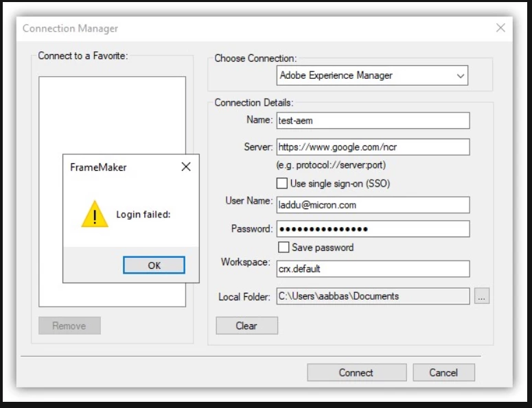 When attempting to connect to an AEM repository using FrameMaker 2020, regardless of server I provide and what credentials are supplied, I immediately get the " Login Failed: " error.
