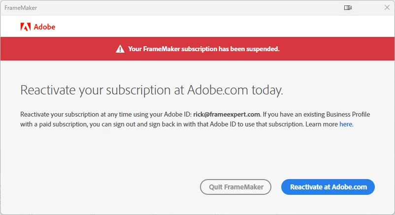 FrameMaker subscription suspended