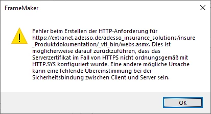 So, this issue is kind of strange: at our company, we've established Sharepoint as a CMS solution for FrameMaker. It has been functioning fairly well so far (abysmal file access "speed" aside). Yesterday, our IT department deactivated TLS 1.0 support, and all of a sudden, I can't connect to Sharepoint anymore from within FrameMaker. I'm getting an HTTP error message (can't give you the exact message text in plain English, because it's actually in German 🤷♀️). Anyway, it's mentioning a possible certificate error, possibly because of HTTPS not being properly configured with HTTP SYS.