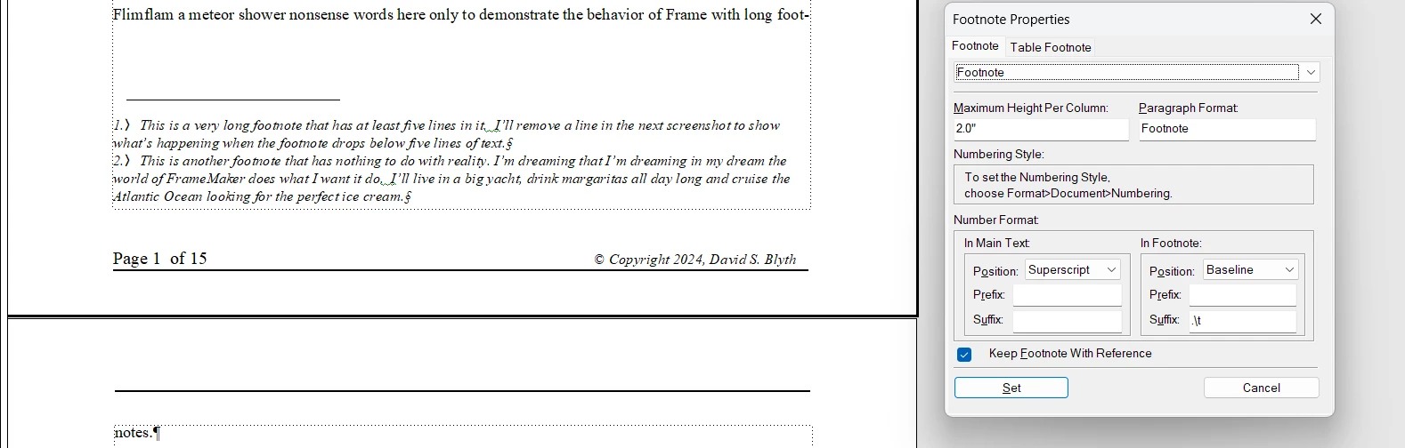Specifically, Frame inserts a gap of about 1 inch between the body text and the footnotes any time the footnote (or footnotes) exceeds four lines of text. A paragraph can rattle along, get to an EOL then boom! Frame inserts the gap, cites the footnotes (correctly) then creates an ophan on the next page to finish the paragraph.