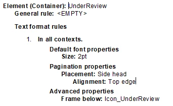 When using this element in a table, the image (Icon_UnderReview) is added above the text in the cell. Is there a way to have the image still appear in the side head next to the respective table row? I don't want to use an Anchored Frame as that will require the reviewer to manually insert the graphic every time.