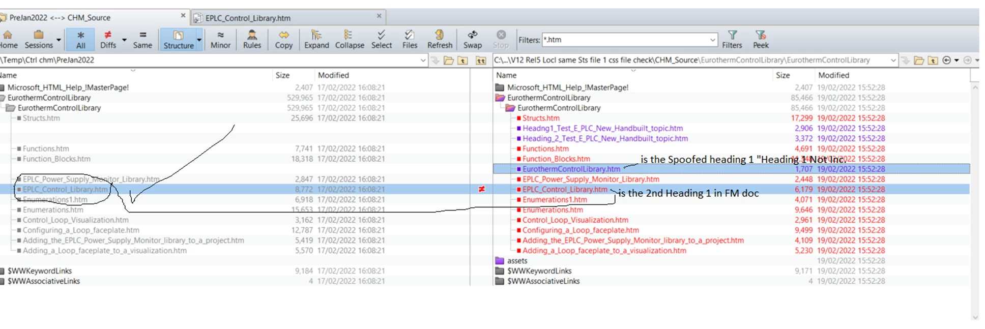 After a file comparing both the new revised version and the old 2015 versions decompiled chm files (control.chm) I was surprised to see AFM2017 was changing the 1st topics HTM filename, i.e. the FM Content heading 1 titel is: EPLC Control Library – H1 is configured in the STS file to be included into the HTML file (& CSS) - but the htm filename applied by the AFM 2017 was EurothermControlLibrary.htm – possibly a default from the AFM Book.