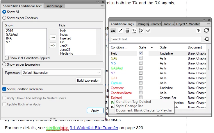 I am back to FrameMaker after years and never used conditions. From what I understand. The selected text has only one condition applied (Help) and that condition is on the Hide side. I did click Apply. An instance of this condition did become hidden, but many are still showing. Please help. Why is this not hidden?