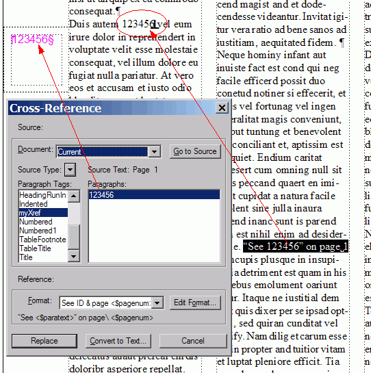 4. From the location that you want the xref, insert your xref format and use the myXref paratag as the target.