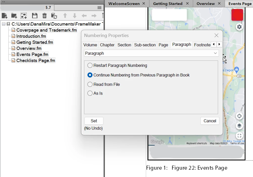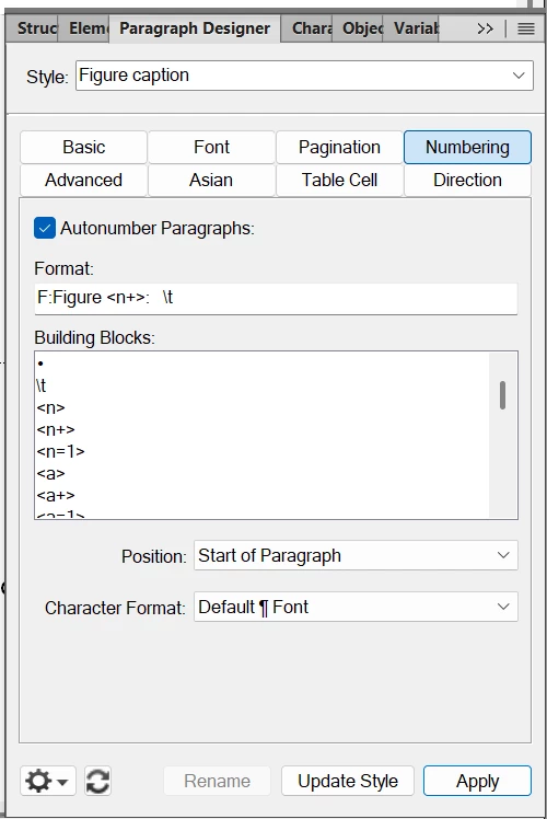 Hi, I need help with regards to the figure numbering in FrameMaker. I have preexisting styles for figures and I started using the figure style on the first document, but when I use the same figure style in the proceeding documents, the number restarts. Is there a way I can set the figure number to continue from the previous document in the book? Thank you.