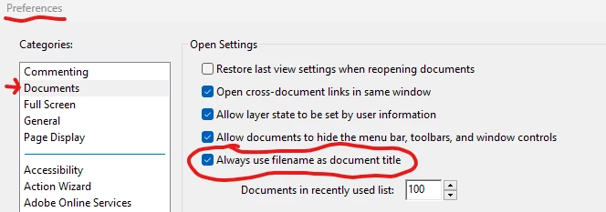 - Open the PDF in Acrobat, go to File > Properties, select the Initial View tab, and in the Window Options sub-panel, select "File Name" for the Show field