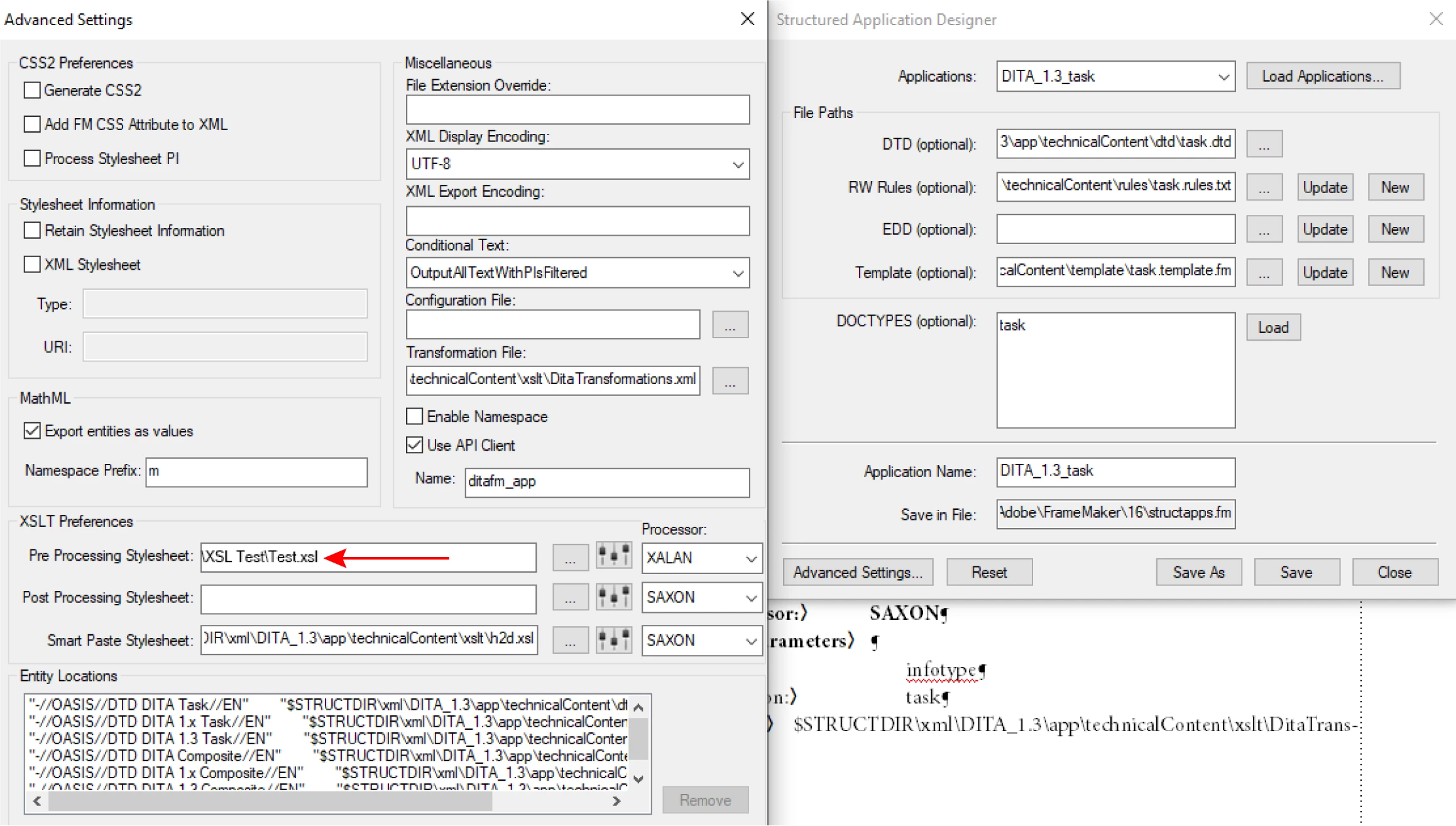I was experimenting with a pre processing stylesheet for a DITA 1.3 task in the Structured Application Designer and would like to remove it now because it doesn't work, but I can't figure out how to in the dialog box. I tried deleting the path, but it reappears when I open the designer. I have looked in the various structapps.fm files, but the path is not there. How can I revert everything to the default settings?