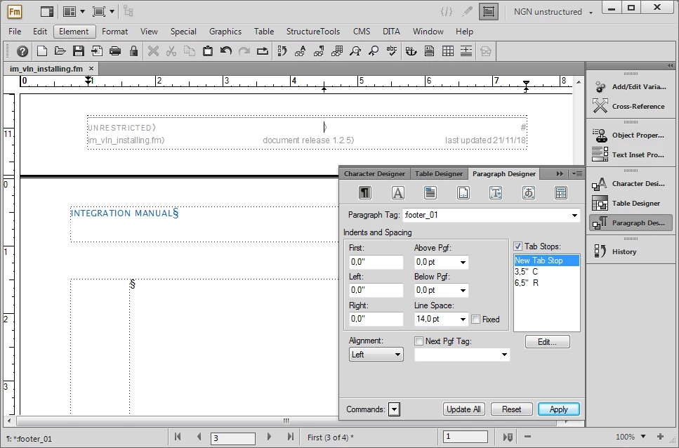 I know how to insert variables and text in a footer, but I am trying to separate the different elements for example, I would like the title on the left side of the footer and the page# on the right side. I've experimented with tab stops, but it is not giving me the desired results. Thanks in advance.