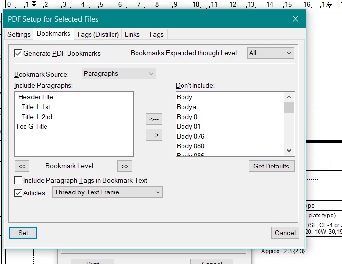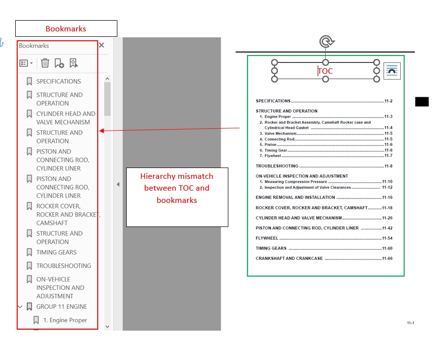 - I need content in TOC hierarchy to be present in PDF book marks panel and i tries the settings in FM couldn't get the expected result (There is a hierarchy mismatch between TOC & Bookmarks in final PDF).