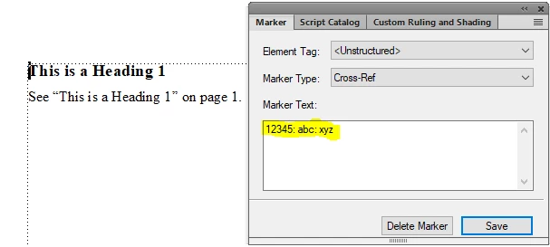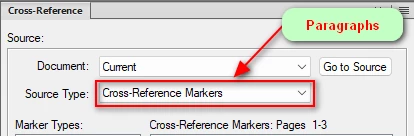 With what I wrote so far, a cross-reference appears to be added to the text Frame, but not text is shown and the Source Type is selected as "Cross-Reference Markers". Here I would like to have "Paragraphs".