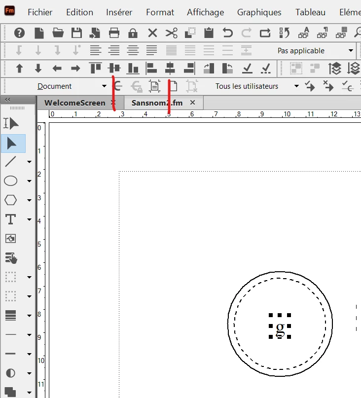 I have succeeded to center the two circles by using the 2 buttons (see red lines).