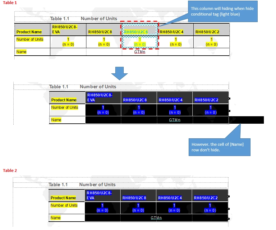In this case, I want to change table 1 into table 2. However. the cell of [Name] row don't hide.